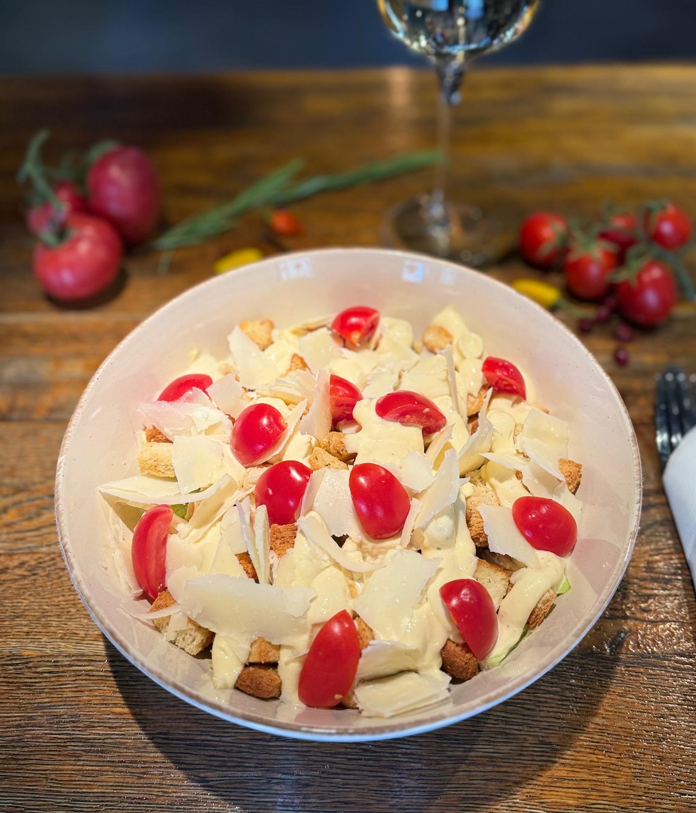 Smksalata iceberg , piept pui , crutoane , roșii cherry , parmezan , dressing
